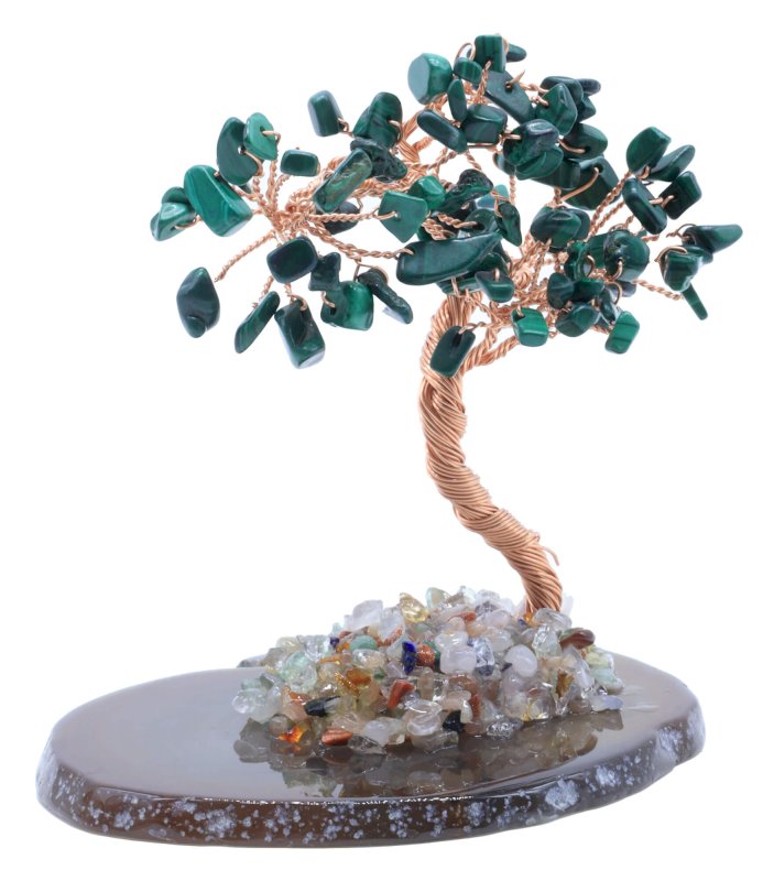Arbre du Bonheur Malachite sur Tranche Agate 12cm